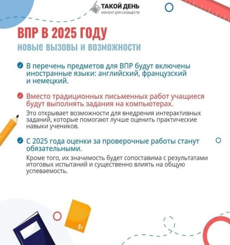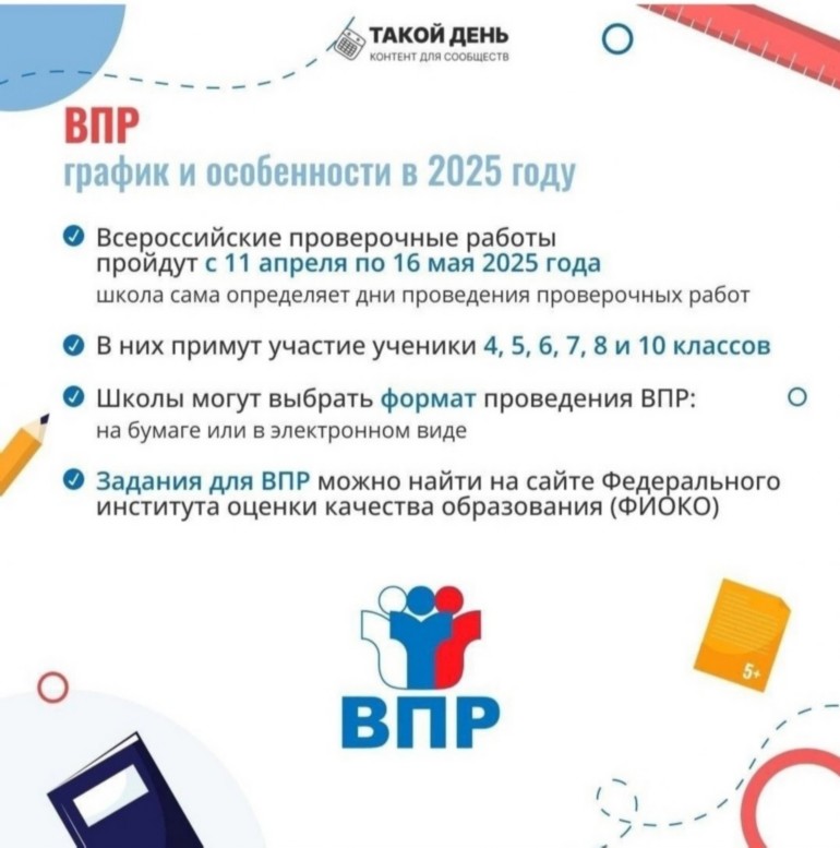 !? Всероссийские проверочные работы (ВПР) в 2025 году пройдут с 11 апреля по 16 мая.